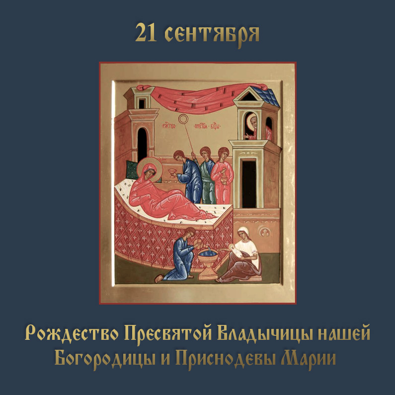 Воскресенье, 21 сентября: 8:15. Малое освящение воды. Часы. Божественная литургия. Лития. Неделя 15-я по Пятидесятнице. Рождество Пресвятой Владычицы нашей Богородицы и Приснодевы Марии.